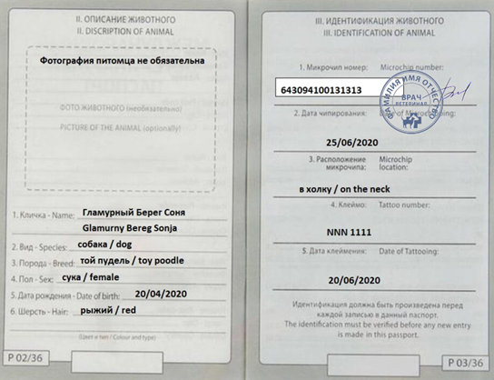 Данные питомца (кличка, окрас, порода, пол) заполняется на английском языке или на русском и английском как показано на примере. Кличка на иностранном языке прописывается так, как она будет прописана в родословной или транслитерацией.
