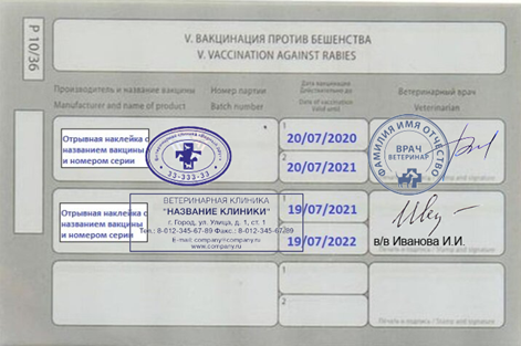 Для вакцинации от бешенства штампы ветклиник с указанием лицензии или полных реквизитов захватывают край наклейки от вакцины таким образом, чтобы данные на наклейке и даты вакцинации оставались читаемыми.